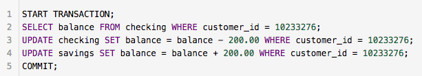 原子性:要么完全提交(10233276的checking余额减少200,savings 的余额增加200),要么完全回滚(两个表的余额都不发生变化)