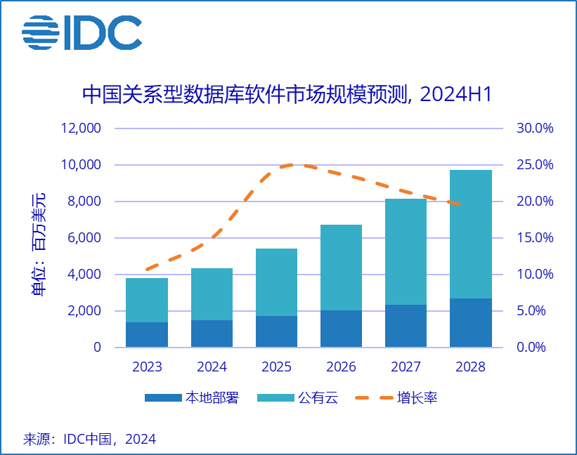 IDC预测, 由于软件国产化以及宏观经济复苏的影响,中国关系型数据库市场将在2025年重新恢复到25%以上的高速增长。到2028年,中国关系型数据库软件市场规模将达到97.6亿美元,2023-2028的5年市场年复合增长率(CAGR)为20.8%。