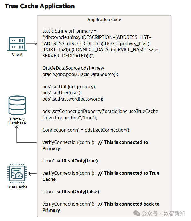 双物理连接模式:应用程序维护两个物理连接:一个连接到主数据库,另一个连接到 True Cache。每个连接都有各自的数据库应用服务,应用程序根据操作类型(读取或写入)选择使用哪个连接。这种模式适用于任何现有的客户端驱动程序和编程语言。 单逻辑连接模式:应用程序维护一个逻辑连接,使用主数据库的数据库应用服务。从 Oracle Database 23c 开始,JDBC Thin 驱动程序会维护到主数据库和 True Cache 的物理连接。这种模式仅适用于 Java 应用程序。应用程序无需指定实例名称即可在 True Cache 和主数据库之间切换。通过调用特定的方法将逻辑连接标记为只读或读写:如果是只读,查询会被发送到 True Cache;否则,发送到主数据库。