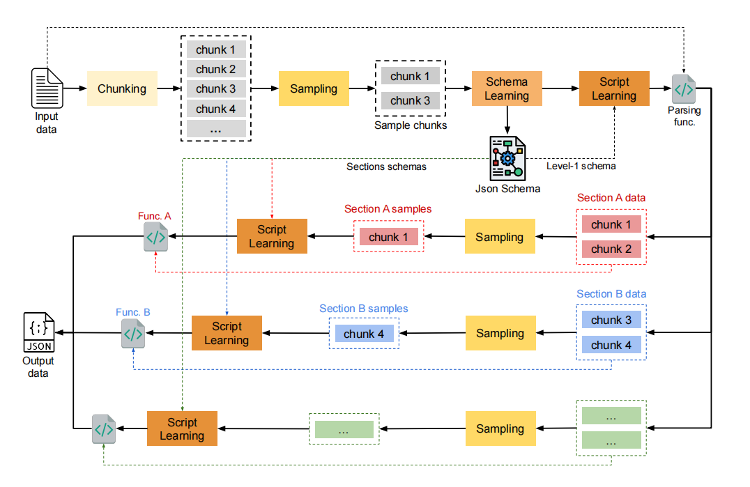 生成代码:将源数据样本提交给 LLM,生成初始的解析代码。