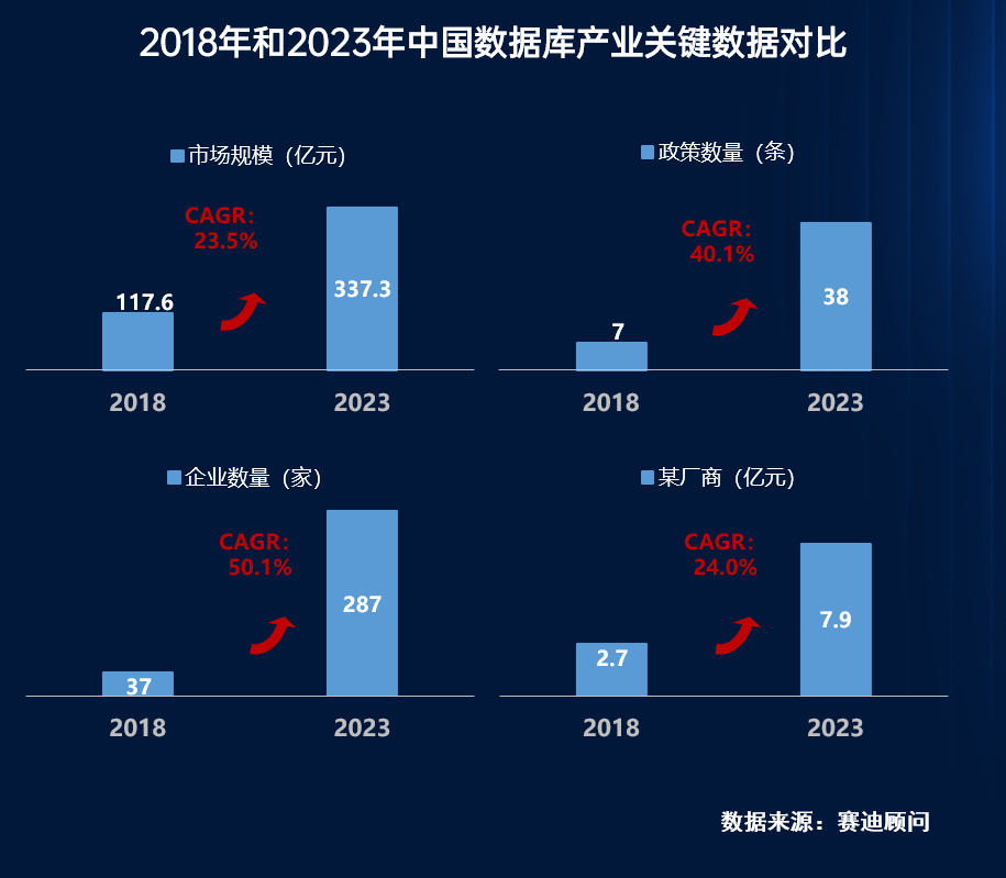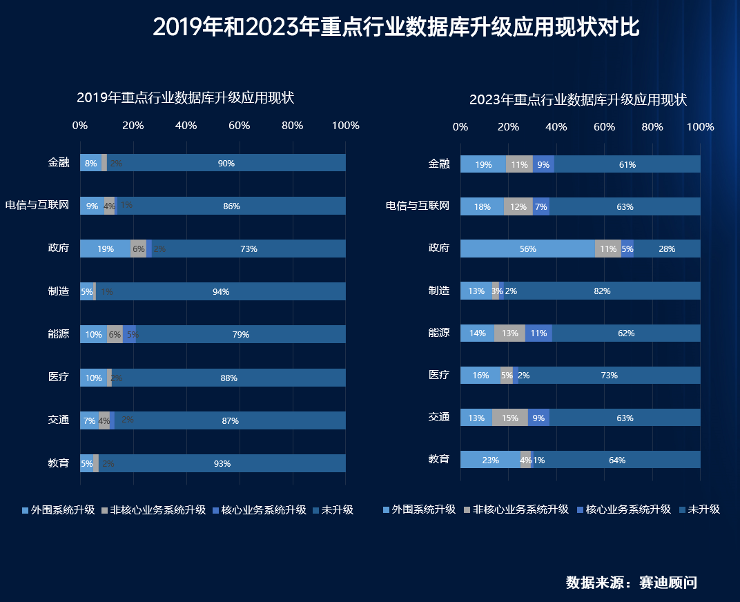 从行业应用来看,相比于2019年,2023年重点行业的数据库升级完成了30%-60%,主要以外围系统和非核心业务系统为主。从去年开始,核心业务系统升级开始大规模展开,但可以感受到升级难度明显加大,因此速度相对较慢。但我们相信在数据库厂商和行业用户的共同努力下,核心业务系统大规模升级也会在未来几年完成,后续市场空间会快速释放。