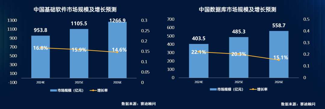 从规模上来看,2024-2026年,中国基础软件市场规模将保持15%左右的增长速度,到2026年将达到1266.9亿元。中国数据库市场规模仍将继续保持增长的态势,预计到2026年会达到558.7亿元。