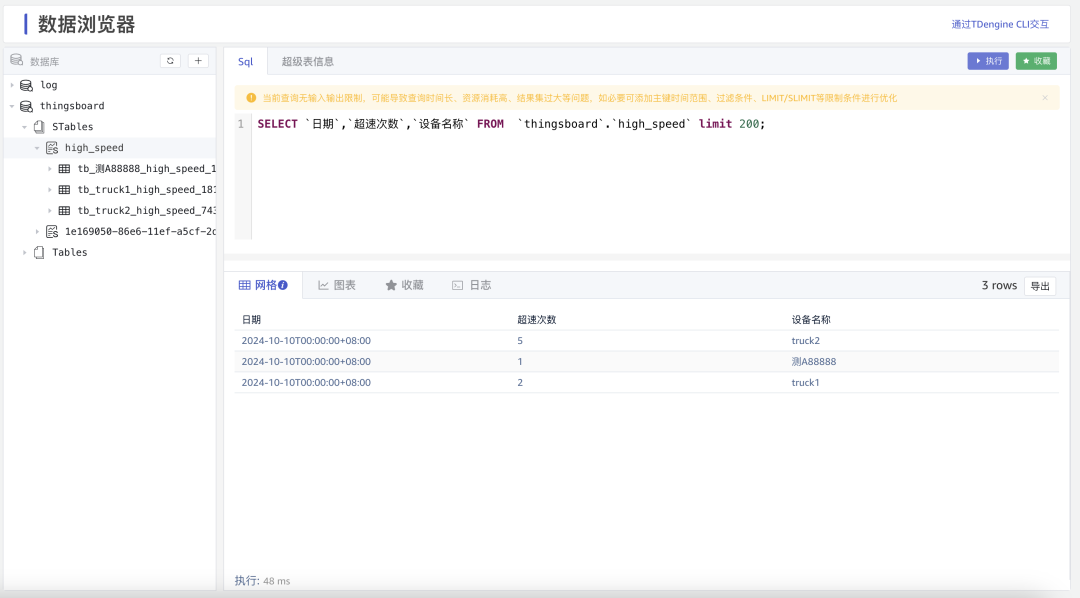 create stream high_speed fill_history 1 into high_speed subtable(concat('tb_', device_name)) asselect_wstart as 日期,count(speed) as 超速次数,device_name as 设备名称from`1e169050-86e6-11ef-a5cf-2de52a1b0351`wherespeed > 90 partition by device_name interval(1d);