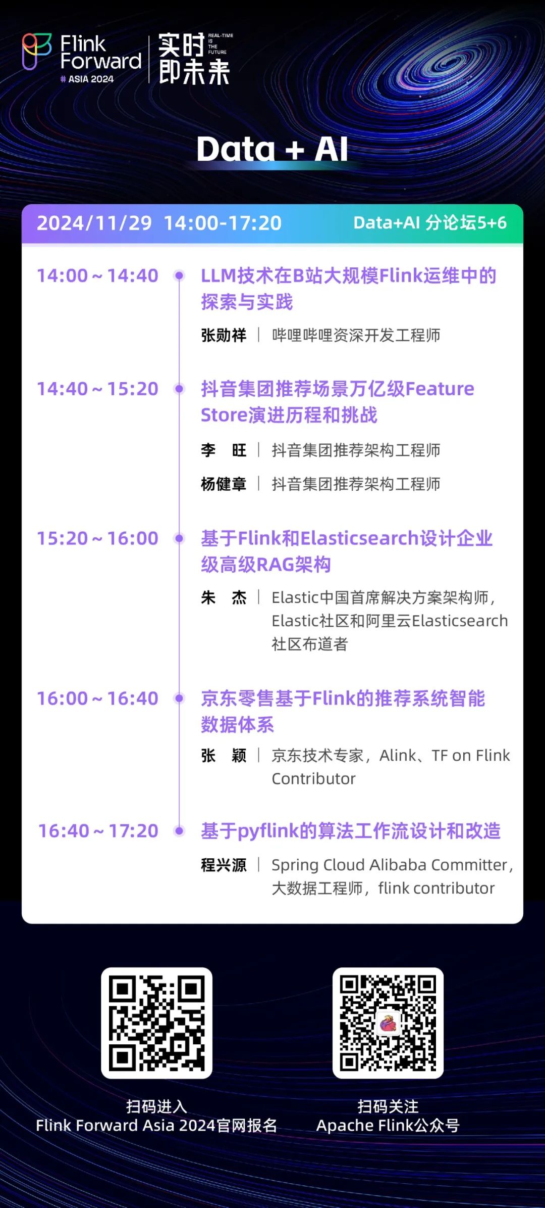 FFA2024Data+AI专场由 Apache Flink 核心贡献者与来自哔哩哔哩、抖音集团、Elastic、京东、硕橙科技等公司的一线技术专家带来,聚焦实时大数据处理与人工智能的前沿融合,共同探讨如何利用Flink助力AI大模型技术的实时化升级,议题涵盖但不限于特征工程、训练、推理、大模型架构优化、以及实时AI大模型在各行业领域的创新应用。