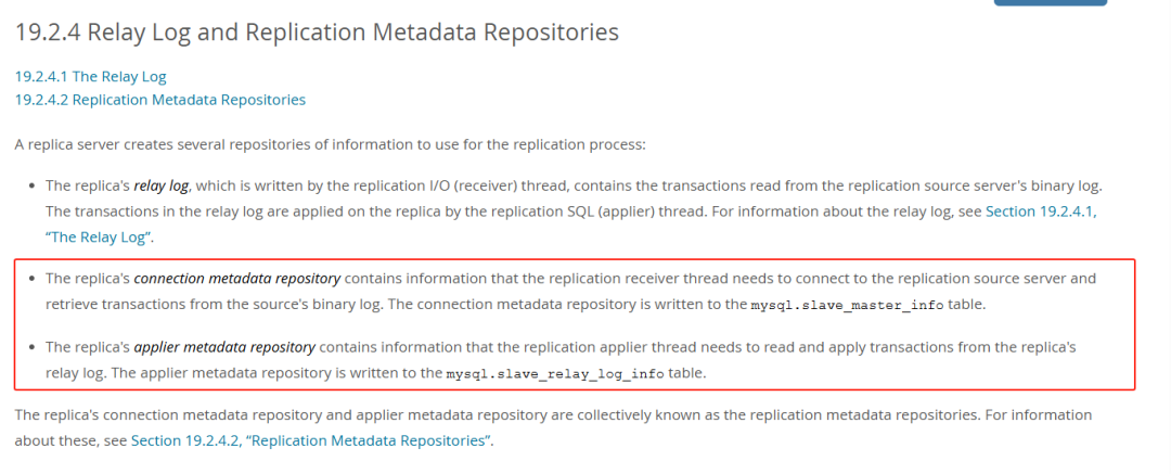 表中。副本的应用程序元数据存储库,包含复制应用程序线程需要从副本的中继日志读取和应用事务的信息。应用程序元数据存储库被写入 mysql.slave_relay_log_info