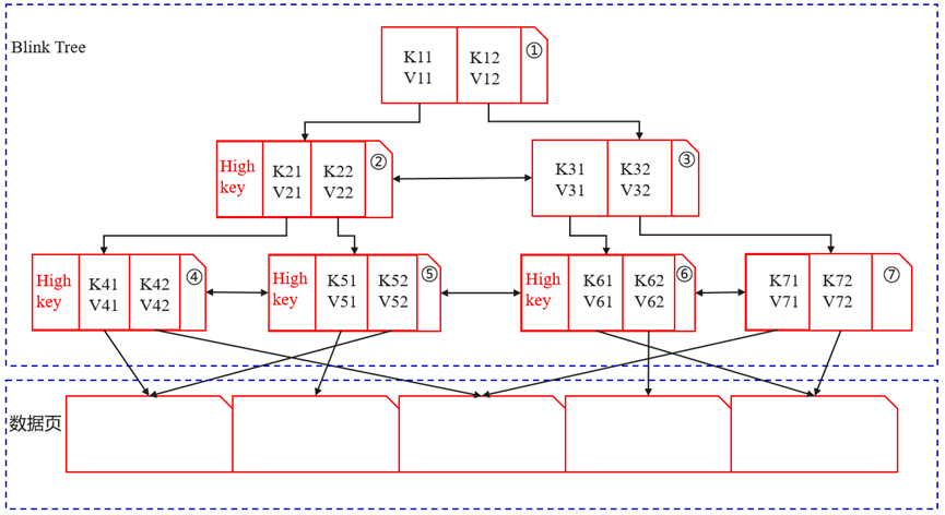 图1中①到⑦都是独立的索引页面,GaussDB默认页面大小都是8K,采用堆表引擎结构,其中索引页和数据页分开存储。索引的叶子节点保留有指向数据页的行指针<K, V>,相比于传统B+树索引,Blink Tree具有以下特点: