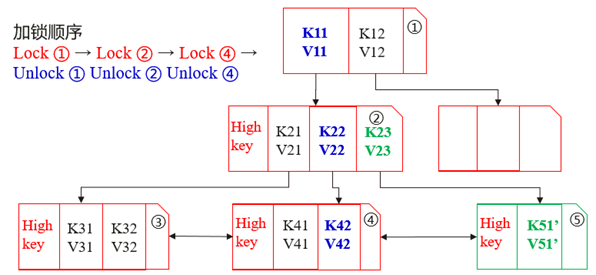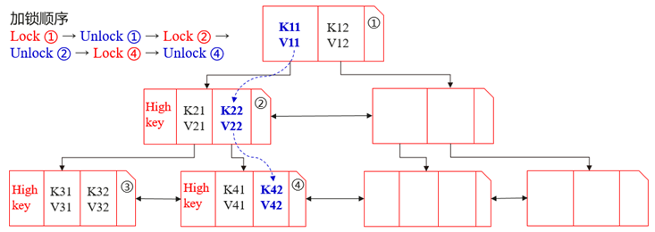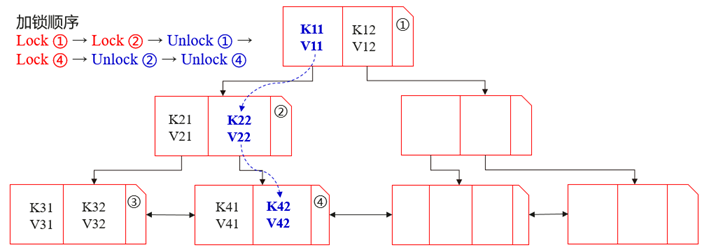 V22>,同时释放节点①的锁。之后,事务会锁住节点④,继续二分查找,直到找到目标值<K42, V42>,再释放掉节点②的锁,最后会释放节点④的锁。