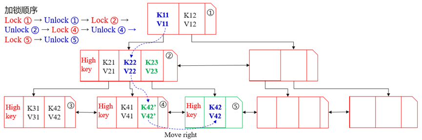 当查询事务再次Lock ④后,通过比较目标key,即K42和节点④的highkey大小,发现K42大于节点④的highkey,这说明K42已经不存在于节点④内部,而是存在于节点④右边的某个节点中(BTree索引和UBTree索引有约束,节点只能往右分裂)。此时会启动move right机制,从节点④开始往右遍历,直到找到一个highkey大于K42的节点,在图4中就是节点⑤。最后,在节点⑤中找到目标元组<K42, V42>。在这个过程中,同一时刻仍然最多持有一把锁。