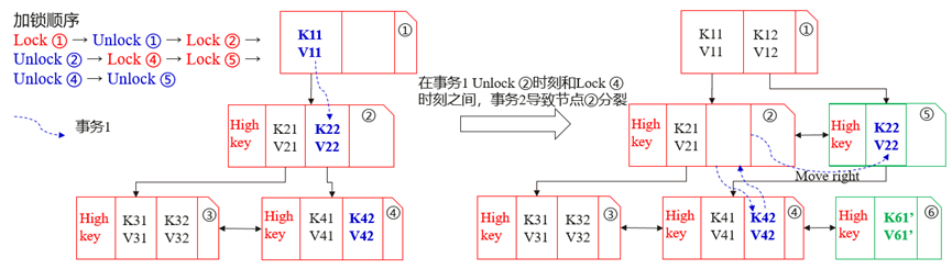 更直观地,以图4的例子来说,当查询事务在执行到Unlock ②与Lock ④之间的时间段时,如果有另外一个写事务插入了数据<K42’, V42’>,这将导致节点④发生了分裂,从而使得目标元组<K42, V42>转移到了新分裂的节点⑤中。