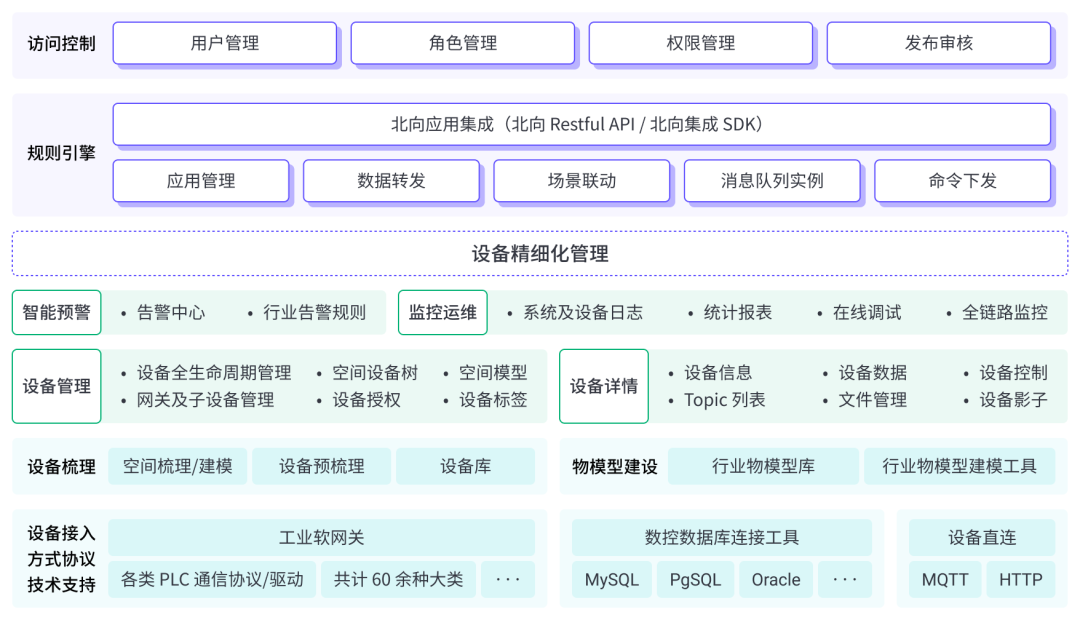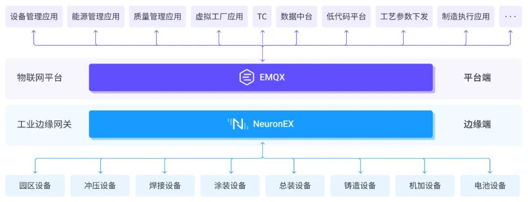 在设备侧,基于 EMQ NeuronEX 工业边缘网关提供的低时延、高性能设备数据接入能力,平台得以屏蔽底层硬件的差异,解决设备间、设备和应用间互联互通难的问题,为上层应用提供数据基础。