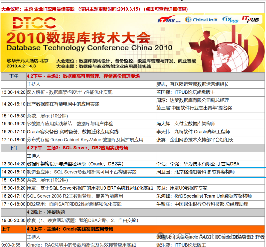 后话:其实那些年还在大搞特搞Oracle , SQL SERVER的时候,格瑞趋势在SQL SERVER行业里面就很有名,这是那段历史,数据库大会都有他们,2010年的数据库大会,到现在好久了,2010年盖老师还是ITPUB的Super版主,牛行长还是助理的那些数据库日子里,他们都那么年轻,那是我们的青春。