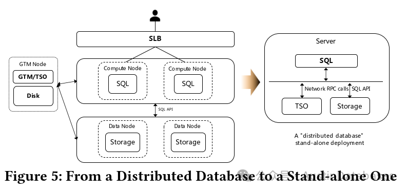 如图 5 右侧所示,如果将这个分布式数据库以一种非常简单的方式插入到一个节点中,并以单机方式运行,就会发现最大的问题。在单台机器上工作时,这些组件之间的交互成本非常高。对于像 MySQL 这样的单机数据库来说,这种开销本质上是一种额外的不必要的开销,因此很明显,这种简单的方法很难与单机数据库相提并论。
