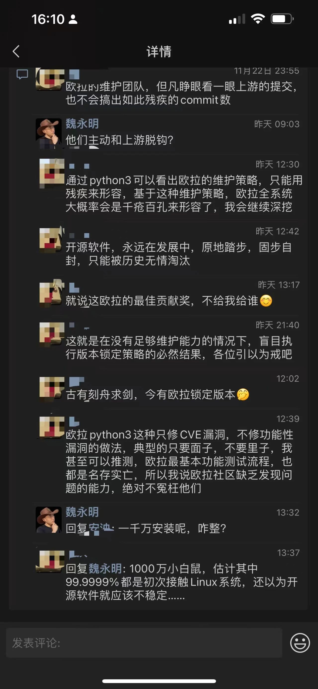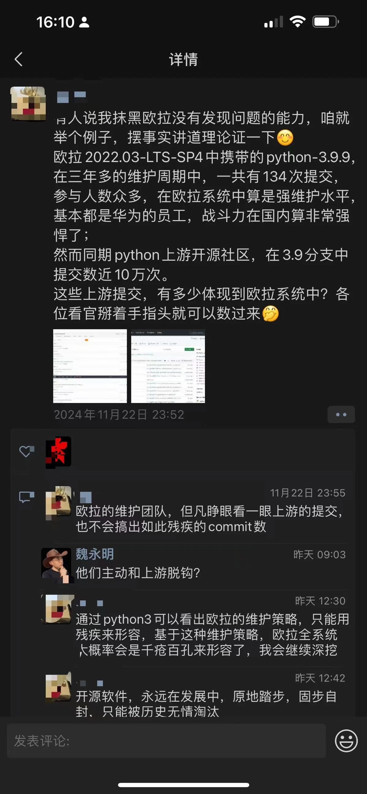 其次,国内的基础软件水平离漂亮国还有很大的距离。这是我们必须要承认的事实。几乎所有的基础软件根技术以及相应的开源社区都在欧美那边。这些根技术有通用操作系统内核 Linux、C 系编程语言编译器如 GCC/LLVM、基础函数库如 Glibc、浏览器引擎如 Webkit/Chromium/Gecko、Java 生态相关软件、Web 相关标准及规范、Python 语言规范及解释器、GPU 相关软件组件(OpenGL/Valkan/CUDA)等等。这些根技术是半个世纪以来,无数全球顶尖的计算机科学家、软件工程师协同工作的成果,遗憾的是我国在这些根技术上的贡献几乎可以忽略。在这种情况下,试图从某个版本分叉然后自行维护和发展,将是固步自封,最终一定会走向死胡同。作为一项证据,请见下面的朋友圈截图: