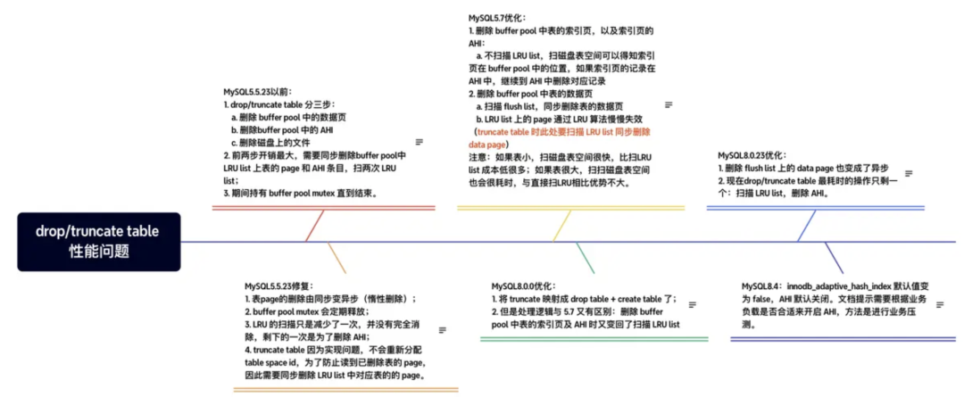 优化后变成:扫描一次 LRU list 来删除 AHI;扫描一次 flush list 来删除表的数据页;并且buffer pool mutex 会定期释放,不再是一直持有直到扫描完 LRU list(这样持有 mutex 的时间太长,会阻塞其他请求)。