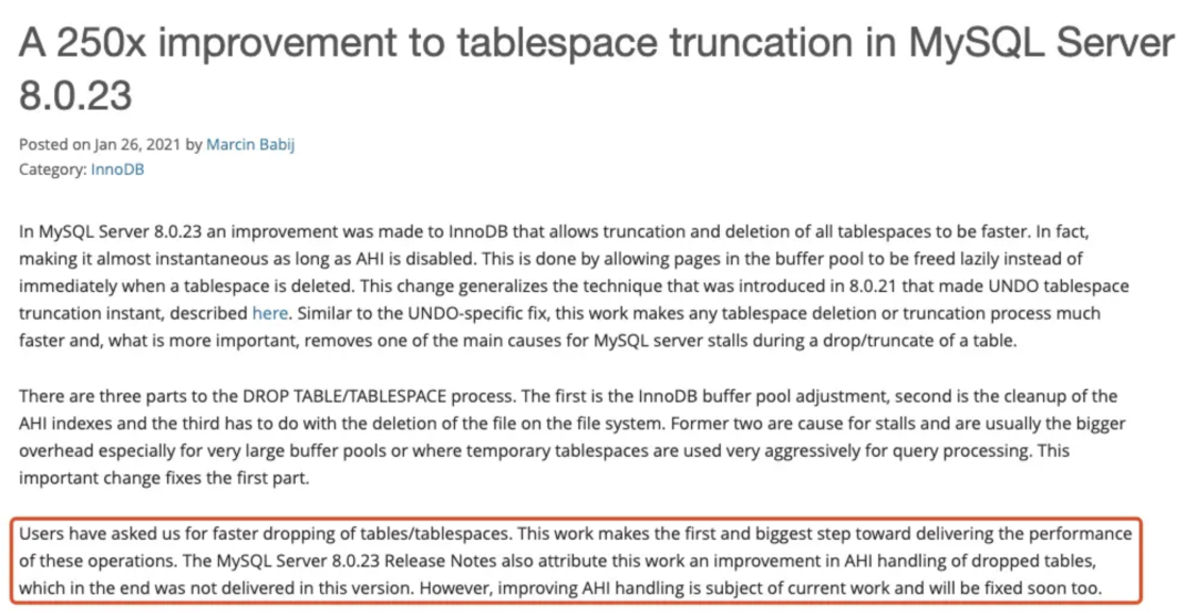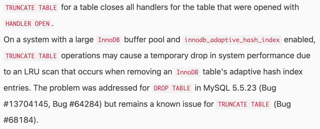 一句话总结官方手册的意思:“MySQL 5.5.23解决了 DROP TABLE 的性能问题,8.0 解决了 TRUNCATE TABLE 的性能问题”。但显然这不是事实,在我们的体验中,无论是MySQL5.7还是8.0都依然存在 truncate/drop table 导致的MySQL hang甚至crash。