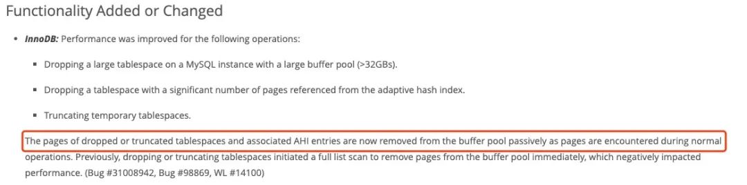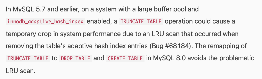 备注:这个说法我怀疑是因果倒置了。要知道 MySQL5.7中 truncate table 是不会重新分配 space id 的,因此需要同步删除 LRU list 中的page。再来看 8.0 将 truncate 映射成 drop table + create table,这是为了解决同步删除 page 的问题,8.0 中 truncate table 会重新分配 space id 这件事只是一种修复后的结果。
