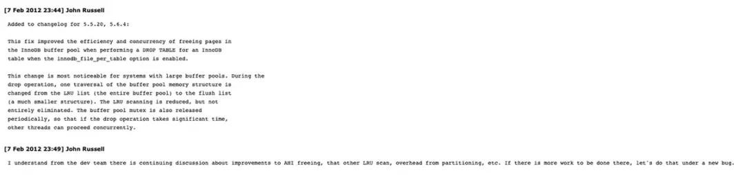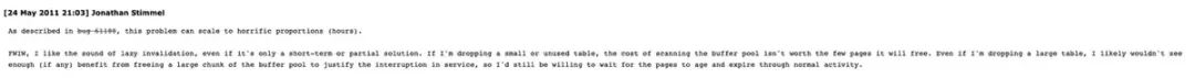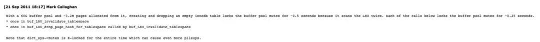 这条评论的大意是对于 60G 的缓冲池和其中分配的约 320 万页,删除一个空的 innodb 表会将缓冲池互斥锁锁定约 0.5 秒,因为它会扫描 LRU 两次: