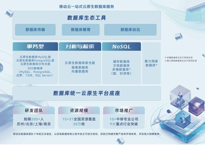 移动云围绕“云原生+全场景+自主可控”这一核心定位打造一站式产品家族,具备事务型、分析与检索型、NoSQL等多种类型的数据库服务能力。同时,针对算网融合发展趋势,移动云还启动了新一代算力网络数据库的规划设计。
