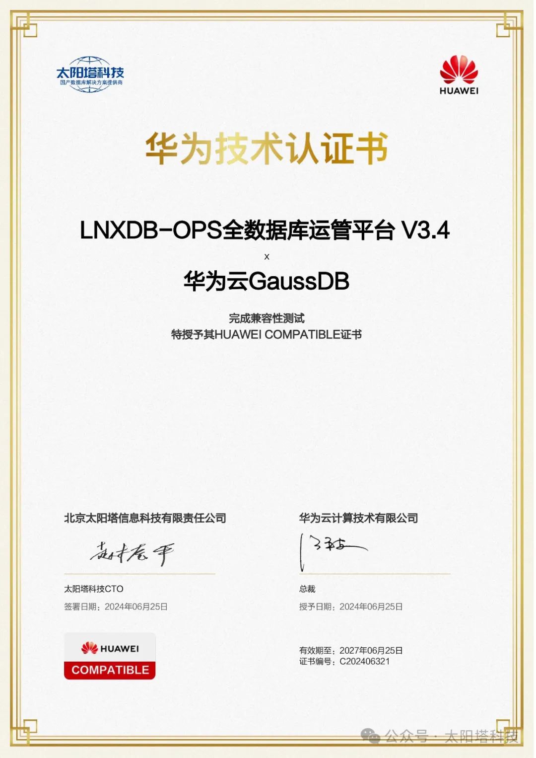 [2024年6月25日,深圳]-太阳塔科技旗舰产品LNXDB-OPS全数据库运管平台正式通过华为云GaussDB Compatible认证。这一认证的获得标志着LNXDB-OPS平台在兼容性、性能和安全性方面均达到了业界领先水平,并且能够与华为云GaussDB数据库无缝集成,为客户提供更加稳定、高效的数据管理解决方案。