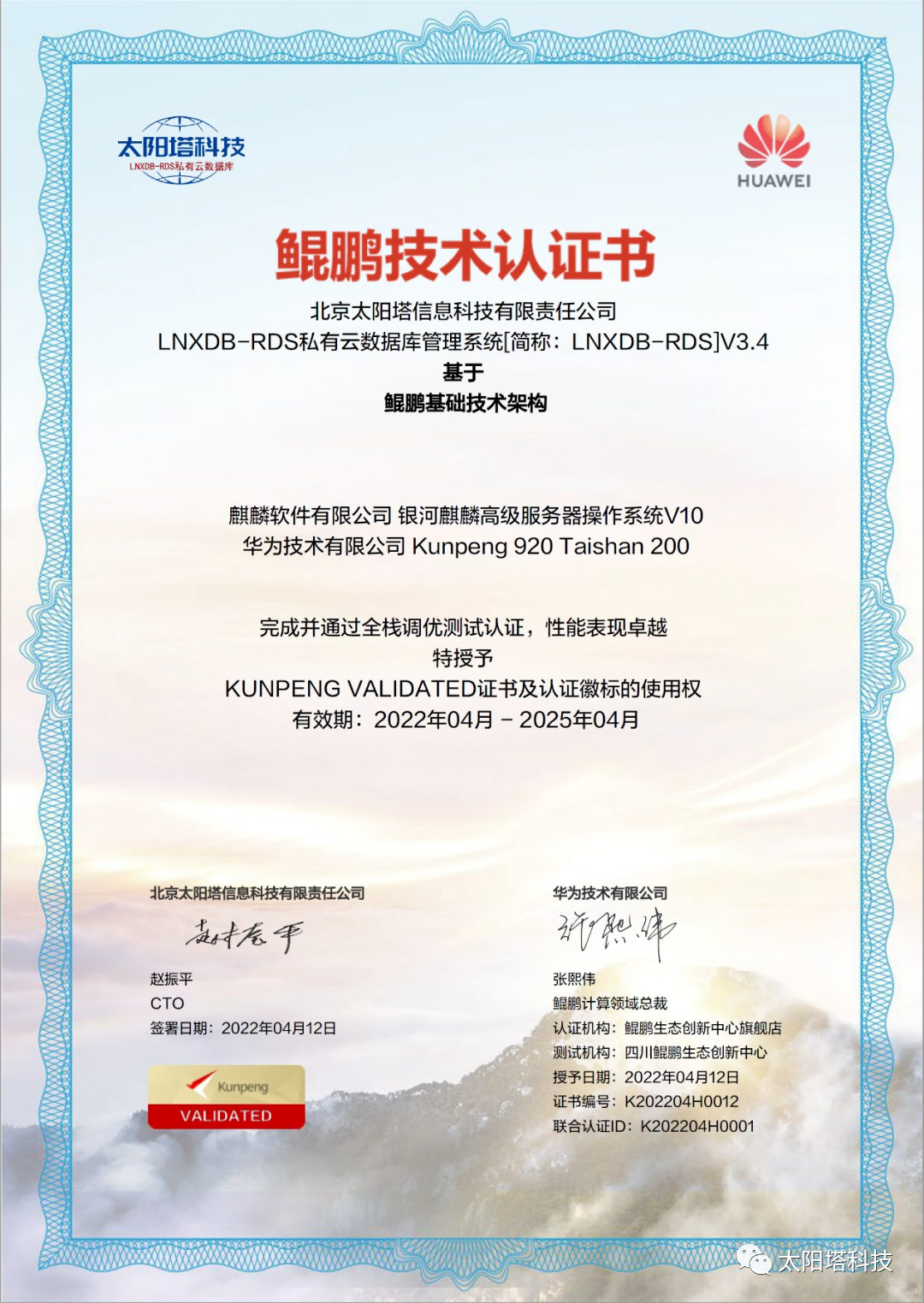 太阳塔科技作为鲲鹏计算产业生态的重要伙伴,与鲲鹏生态创新中心建立长期合作关系。此前已通过鲲鹏服务器认证,实现了与鲲鹏生态的良好融合,今后将与鲲鹏生态创新中心携手实现私有云数据库领域的全方位布局,进一步实现技术和业务的多方面合作,为客户提供更多的优质解决方案,共同为我国企业数字化转型发力。
