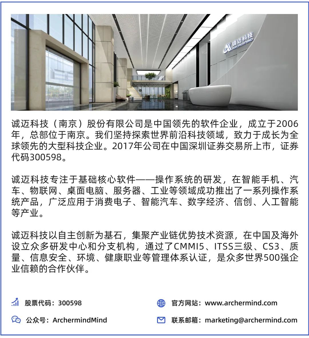 诚迈科技是鸿蒙生态系统的核心共建伙伴,同时也是将鸿蒙带入中国工业软件领域的实践先锋,发布了国内首个开源鸿蒙工业发行版操作系统HongZOS。公司致力于通过持续的技术、产品和服务创新,助力工业制造行业数字化转型,为建设工业强国保驾护航。目前,诚迈科技已在工业智能终端操作系统、工业互联软总线、以及工业智改数转等方面实现了全面布局。