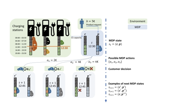 从资料中查询到的关于电动汽车充电动态定价的马尔可夫决策过程(MDP)状态的示意图。该图展示了资源在其销售期结束后的过期情况(容量和产品向量中的灰色部分)。蓝色方块表示MDP状态。在时间步 (t),充电站的容量通过容量向量 (c_t) 表示。向量的元素代表相应时间段(绿色方块中的时间范围)内的可用充电容量。从上一个时间步开始到达的可能充电会话预约请求由向量 (p_t) 表示,其中1表示请求的时间段。基于三个状态变量 (c_t)、(t)、(p_t),定价策略提供一个动作 (a),即充电价格,用户可以接受(底部的前两个状态)或拒绝(右侧的状态)。然后状态转移到下一个时间步(转移函数的详细信息在图4中说明)。接受的充电请求会导致容量值减少。下一个充电会话预约被输入到新状态中。注意,时间步的分辨率必须比充电时间段更精细。灰色显示了关于充电容量和会话向量 (c_t) 和 (p_t) 的过去信息。