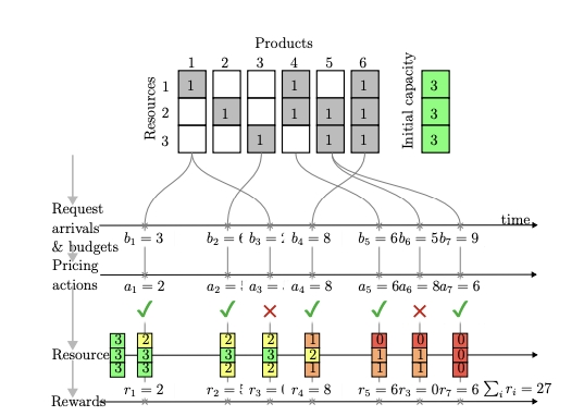 接受与奖励:当客户接受报价(即,当他们的预算 bi 大于或等于定价 ai 时,用绿色的 ✓ 表示),营业部获得一个奖励 ri。这可以是收入或其他绩效指标。同时,骑手资源的可用性根据所售产品的需求而减少。