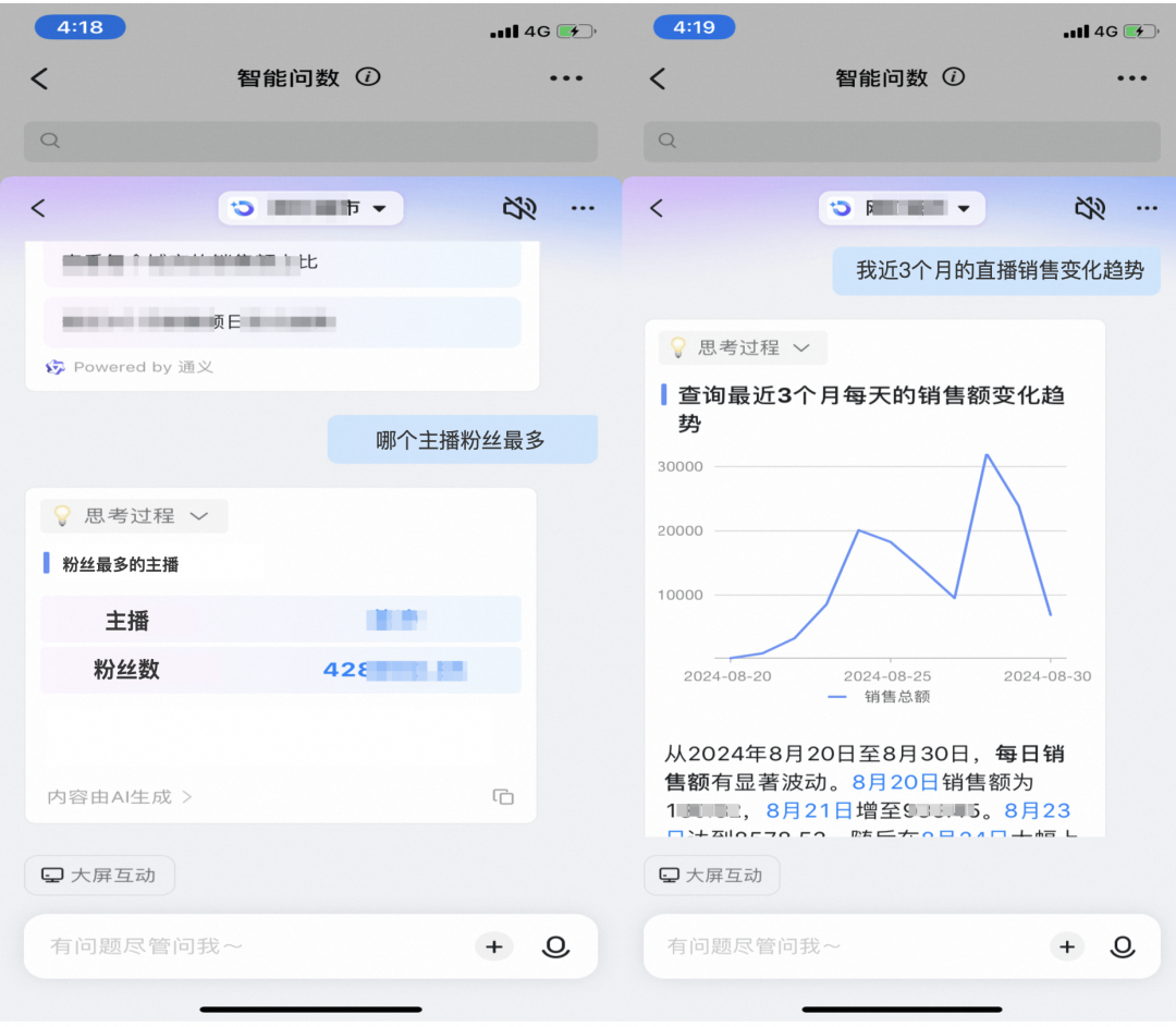 1、大幅降低分析门槛。智能问数服务支持多轮对话,无论是主播还是平台运营人员都能够轻松获取想要的数据,并且问数服务还能根据历史知识、大模型能力结合实际数据情况提供可参考的处理方案,以及这些处理方案对应需要观测的评估指标,方便相关人员构建问数、建议、监测的运营闭环。