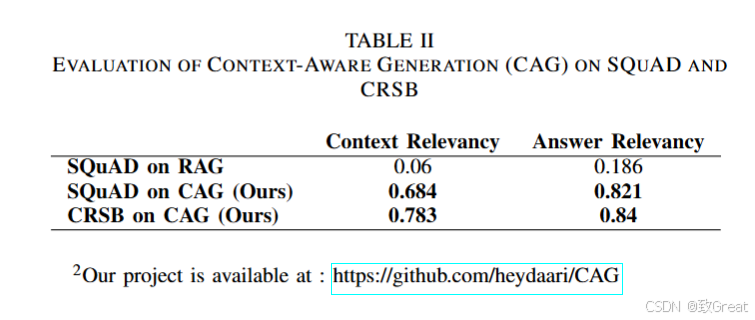 SQuAD数据集上的CAG:CAG方法显著提高了这些指标,达到了0.684的上下文相关性和0.821的答案相关性,表明模型在检索和理解上下文相关信息以及提供更准确答案方面的能力得到了显著增强。