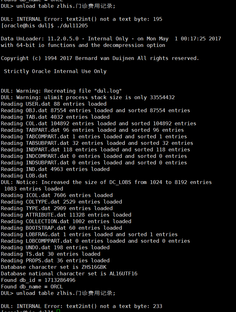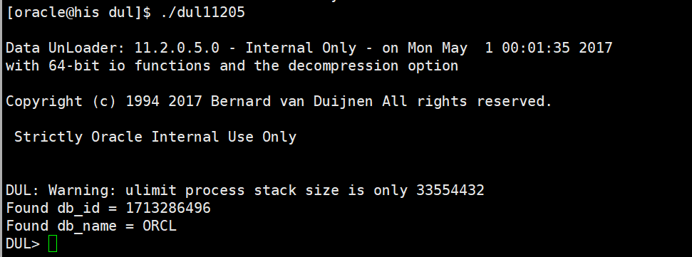 You need a more recent DUL version for this os --这里可以看到必须使用最近的dul,怎么解决呢?观察上面的Copyright (c) 1994 2017 Bernard van Duijnen All rights reserved. 只需要把操作系统时间改为2017年的,然后数据文件也改到那个时间。