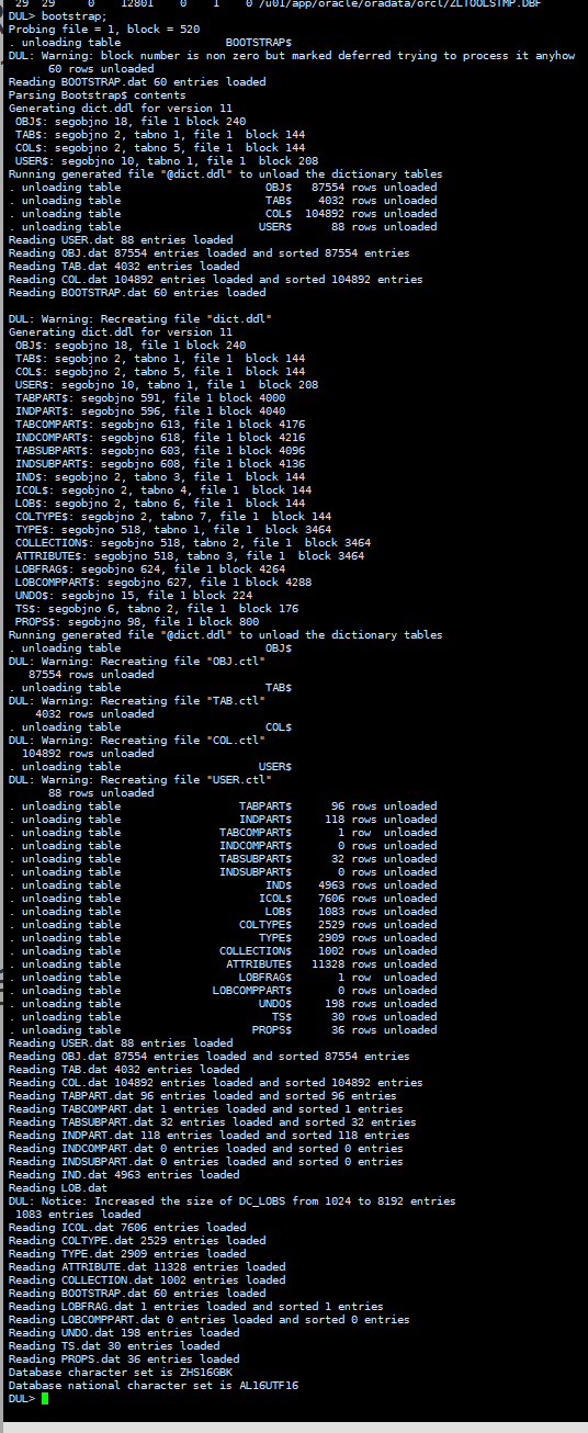 1、单表导出,测试中文不支持,要改为使用用户;unload 全库会遇到DUL: FATAL Error: UTF16 can only be unloaded if LDR_OUTPUT_IN_UTF8=TRUE