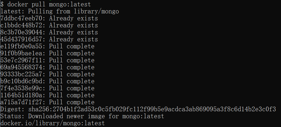 在上图中可以看到我们已经安装了最新版本(latest)的 mongo 镜像。