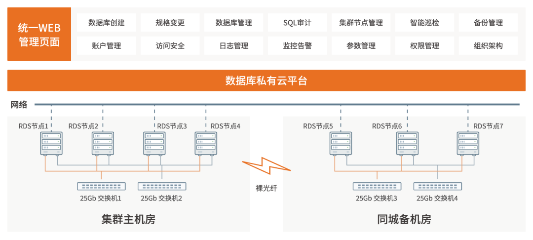 该企业基于沃趣QFusion构建了全新的同城容灾系统。主机房部署4台RDS节点、备机房部署3台RDS节点,当主机房发生整体机房级别故障的时候,备机房接管数据库业务,持续对外提供服务,满足机房级别的RTO要求。