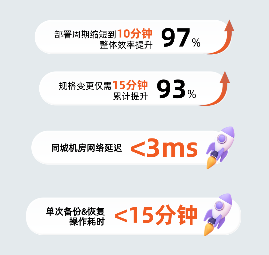 通过服务化交付方式,实现了数据库的快速创建和部署,将部署周期从1-3天缩短至10分钟,整体效率提升97%。