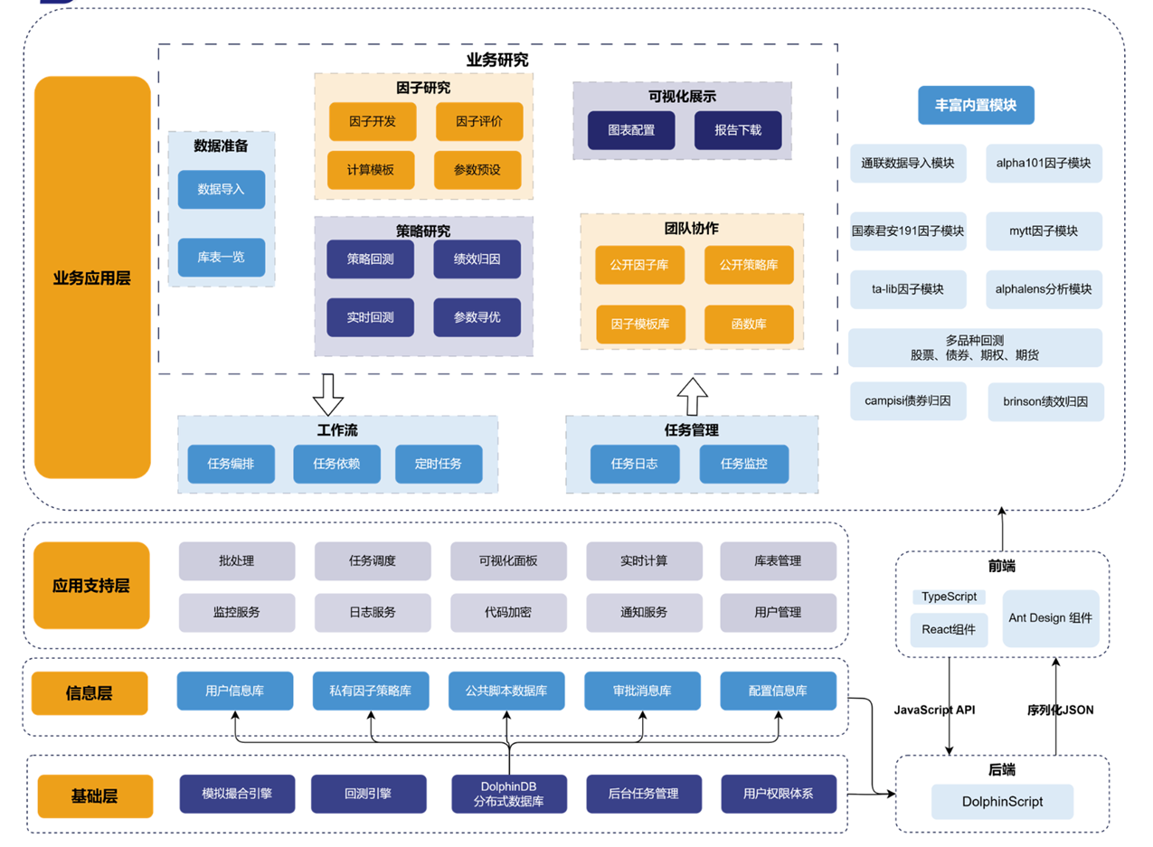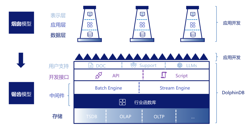 “因此,我们引入了一种成本更低、灵活性更强的开发方案——基于 DolphinDB 二次开发各模块和系统。”周博士介绍道,“我们采用锯齿型开发范式,在一个稳定的多模态数据存取层上,融入了一个功能强大、扩展性强的计算中间层,并通过标准化的 API 和脚本接口向应用层提供服务。”