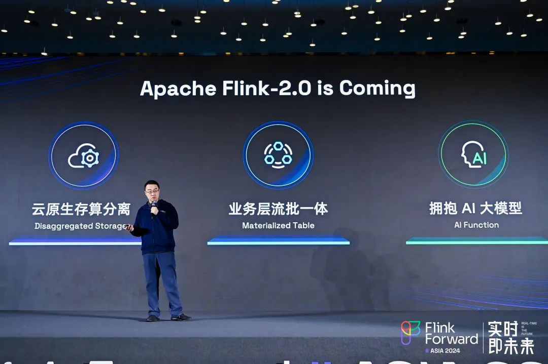 王峰介绍,为了满足大模型应用等新兴场景的需求,阿里云正在主导推进 Flink2.0 的研发,将全方位提升 Flink 的性能和功能易用性,例如将采用全新的存算分离架构、深度融合湖仓架构等。这是2016年 Flink 1.0发 布以来最大规模的更新,该版本将于2025年正式发布。王峰表示:“从使用者,到社区最大的贡献者,阿里巴巴将持续推动 Flink 技术生态的繁荣,让 Flink 普惠千行百业企业。”