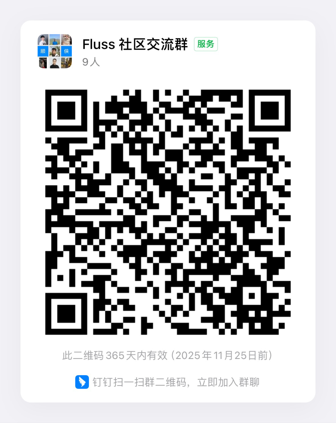 Fluss 目前已经在 GitHub 上以 Apache 2.0 协议正式开源,项目地址为:https://github.com/alibaba/fluss。并且我们计划于 2025 年将其捐赠到 Apache 软件基金会。在此,我们诚挚地邀请各位加入 Fluss 开源社区,共同促进这一新兴项目的成长与发展。欢迎大家扫码加入 Fluss 社区钉钉群,欢迎大家一起探索,参与开发和贡献,并携手构建下一代的流存储技术。