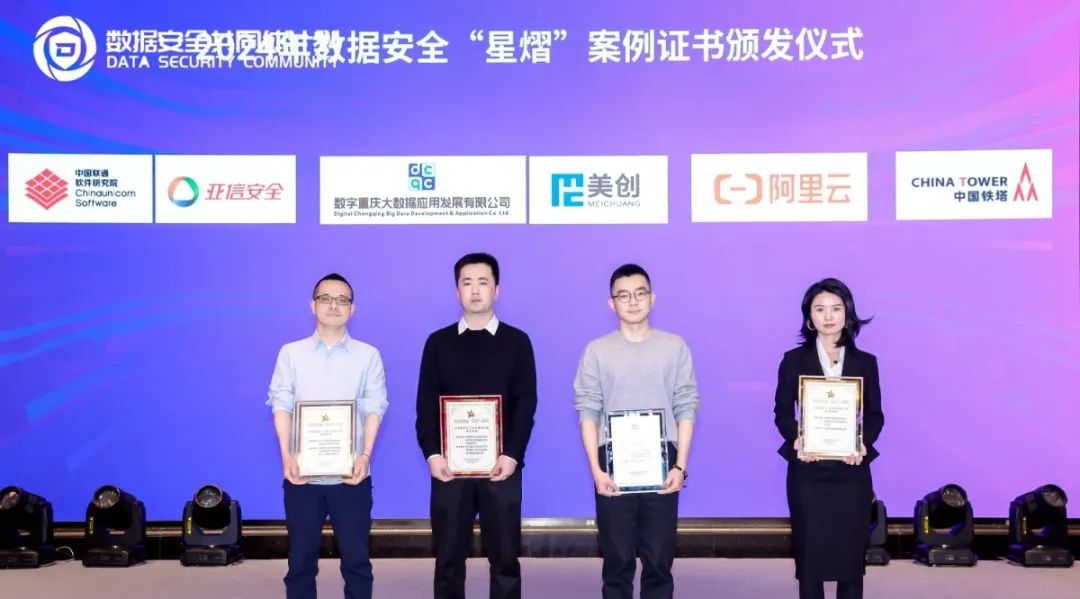 11月28日,由中国信息通信研究院安全所主办,大数据应用与安全创新实验室承办的“数据安全共同体计划成员大会(2024)”在京召开,会上公布2024数据安全“星熠”案例入选名单并颁发证书。数字重庆大数据应用发展有限公司(以下简称“数字重庆公司”)、杭州美创科技股份有限公司(以下简称“美创科技”)联合申报的「数字重庆大数据应用发展有限公司数据安全体系建设项目」获数据安全“星熠”案例荣誉称号。