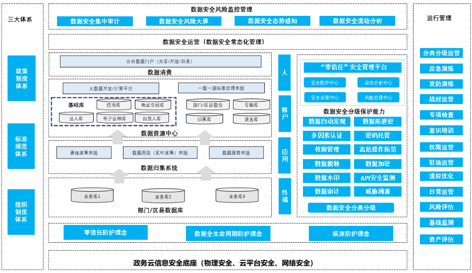 项目制定安全管理组织、落实管理制度、审批流程建设,从组织、制度、流程、服务几个方面进行全域安全运营支撑。提供数据安全服务、数据安全评估、数据安全培训等,形成常规、周期、特色的安全一体化服务能力,保障数据的安全性、合规性、可用性。