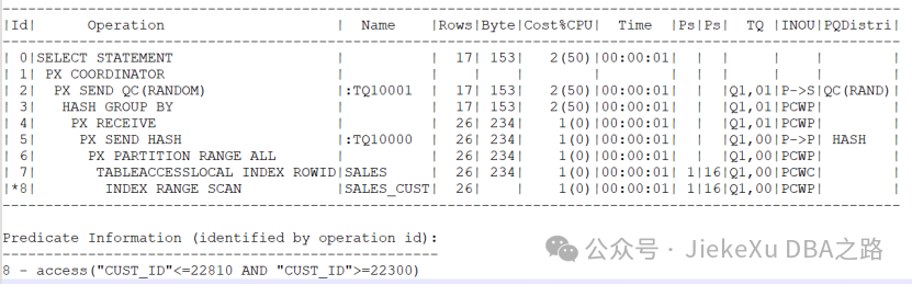 当使用分区粒度时,您会在解释计划输出中的表或索引访问上方看到行 PX PARTITION RANGE。在下面的示例的第 6 行中,该计划具有 PX PARTITION RANGE ALL,因为此语句访问了表中的所有 16 个分区。如果没有访问所有分区,则仅显示 PX PARTITION RANGE。