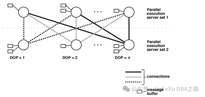 生产者服务器从表中检索行,消费者服务器对这些行执行连接、排序、DML 和 DDL 等操作。生产者集中的每个服务器都与消费者集中的每个服务器建立连接。并行执行服务器之间的虚拟连接数随着并行度的平方而增加。