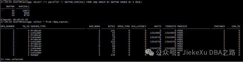 SELECT /*+ parallel */ DEPTNO,SUM(SAL) FROM emp GROUP BY DEPTNO ORDER BY 2 DESC;select * from v$pq_tqstat;