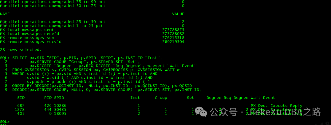 SELECT px.SID "SID", p.PID, p.SPID "SPID", px.INST_ID "Inst",px.SERVER_GROUP "Group", px.SERVER_SET "Set",px.DEGREE "Degree", px.REQ_DEGREE "Req Degree", w.event "Wait Event"FROM GV$SESSION s, GV$PX_SESSION px, GV$PROCESS p, GV$SESSION_WAIT wWHERE s.sid (+) = px.sid AND s.inst_id (+) = px.inst_id ANDs.sid = w.sid (+) AND s.inst_id = w.inst_id (+) ANDs.paddr = p.addr (+) AND s.inst_id = p.inst_id (+)ORDER BY DECODE(px.QCINST_ID, NULL, px.INST_ID, px.QCINST_ID), px.QCSID,DECODE(px.SERVER_GROUP, NULL, 0, px.SERVER_GROUP), px.SERVER_SET, px.INST_ID;