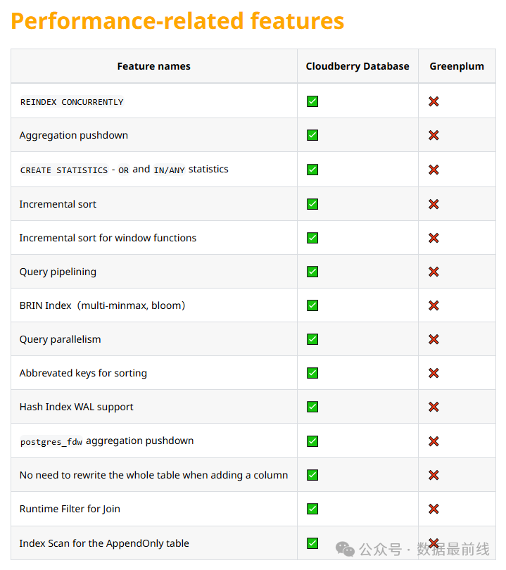 虽然架构上是同源的,但 Cloudberry 提供了比 Greenplum 更为丰富的功能。比如性能上,Cloudberry 支持汇总下推、并行查询及增量排序等诸多 Greenplum 所不支持的功能。