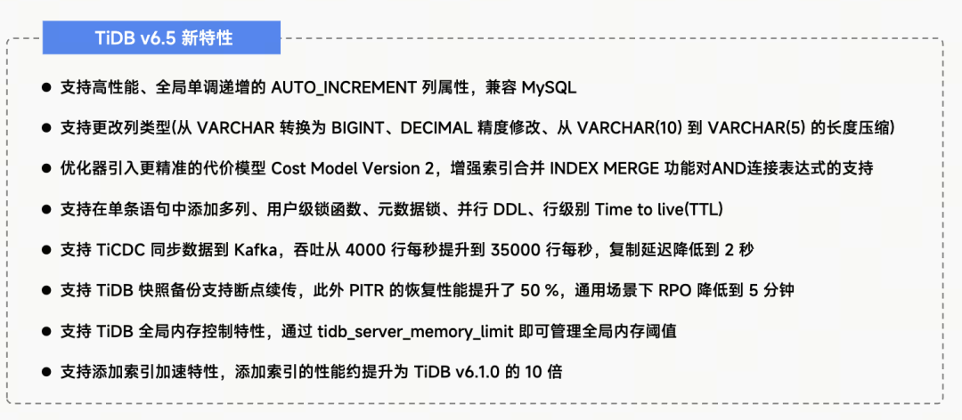 TiDB v6.5:TiDB v6 版本提升了与 MySQL 的兼容性,特别是自增 ID 现在能保证单调递增,满足依赖 ID 排序的业务需求。v6.5 版本支持类型转换,如 VARCHAR 到 BIGINT,简化表结构修改。V2 优化器在 v6.5 中引入,性能显著提升,尤其在 INDEX MERGE 方面,现在支持 AND 条件,优化了查询性能。