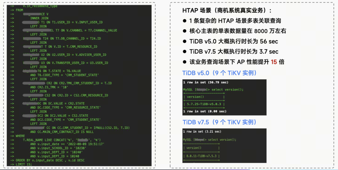 TiDB v7.5:我们正在将商机系统数据同步至 TiDB V7.5 版本集群,关注性能和兼容性。测试显示,V7.5 版本处理复杂 SQL 查询性能显著提升,比 V5.0 版本快约 15 倍。我们计划利用 V7.5 的租户隔离功能,将 TP 和 AP 请求分离,以实现查询的租户级别隔离,并减少非核心业务查询对主库的影响。对于核心业务,建议独立部署以确保稳定性,非关键业务可考虑多租户部署以提高效率。
