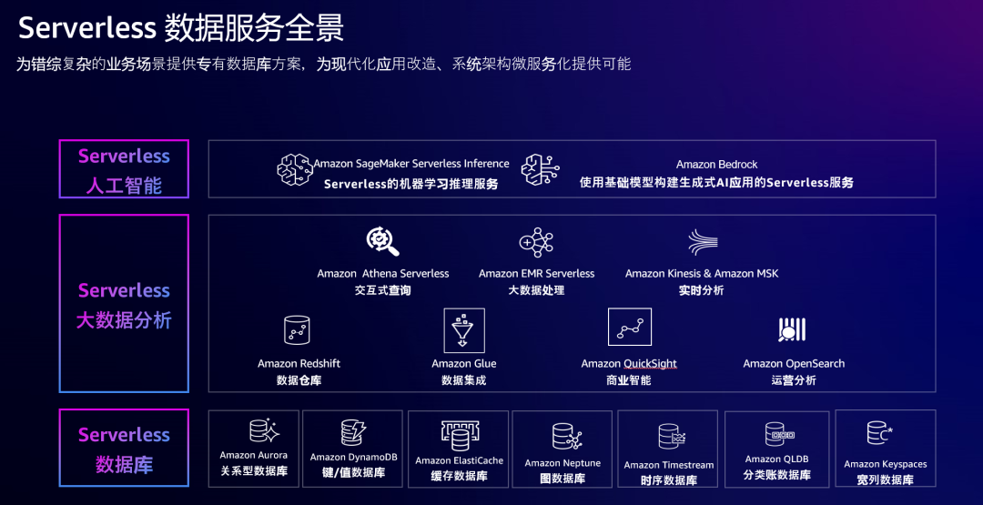 数据则是人工智能和机器学习的基座。凭借领先的数据服务,以及全球庞大的客户数量和应用场景,亚马逊云科技在数据领域积累了丰富的最佳实践与行业经验,持续高速迭代数据与AI服务堆栈。