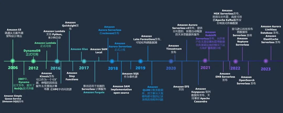 从2006年发布Amazon S3,到现在的18年间,亚马逊云科技一直在Serverless领域持续创新和发展,构筑从数据存储、到数据分析、以及人工智能领域的全栈Serverless: