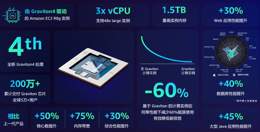 第一代Graviton芯片于2018年推出,而最新一代的Graviton4芯片于2023年re:Invent发布后,已在今年7月完成了大规模部署。