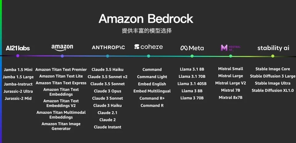 Amazon Bedrock是一项完全托管的服务,客户无需管理任何基础设施,即可调用来自全球领先AI公司的高性能基础模型,以构建安全合规的应用。